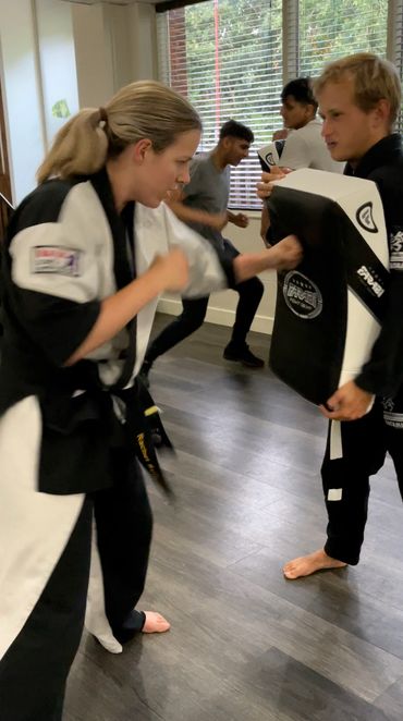 We train Japanese based JuJitsu, Self Defence and Kickboxing. This gives you practical skills in defence on the ground, in stand up situations, weapons defence and Kickboxing. It builds your confidence, discipline and fitness.
